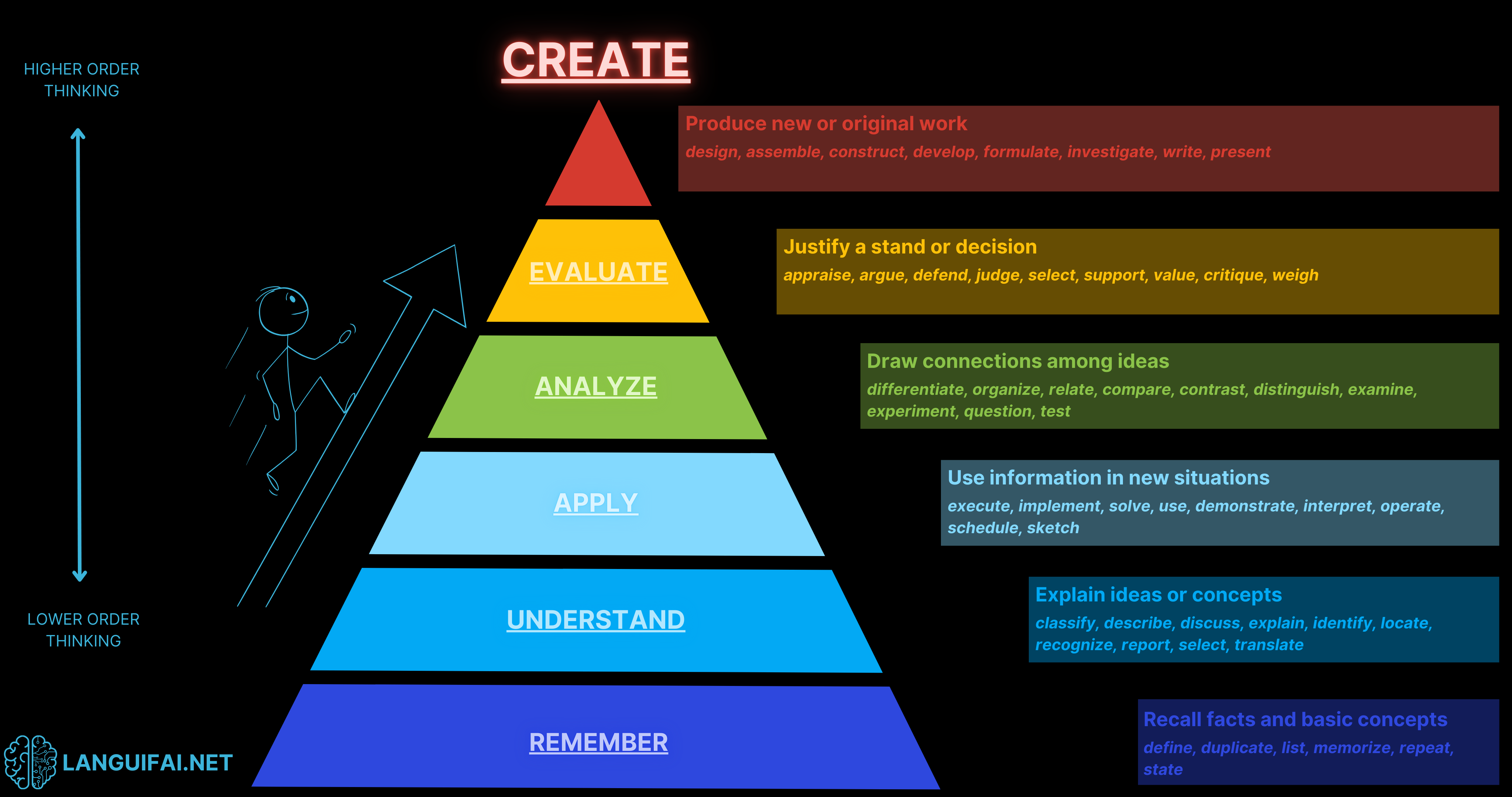 - Remembering: In language learning, this stage involves memorizing vocabulary and grammar rules, which are fundamental to any language learner’s toolkit.